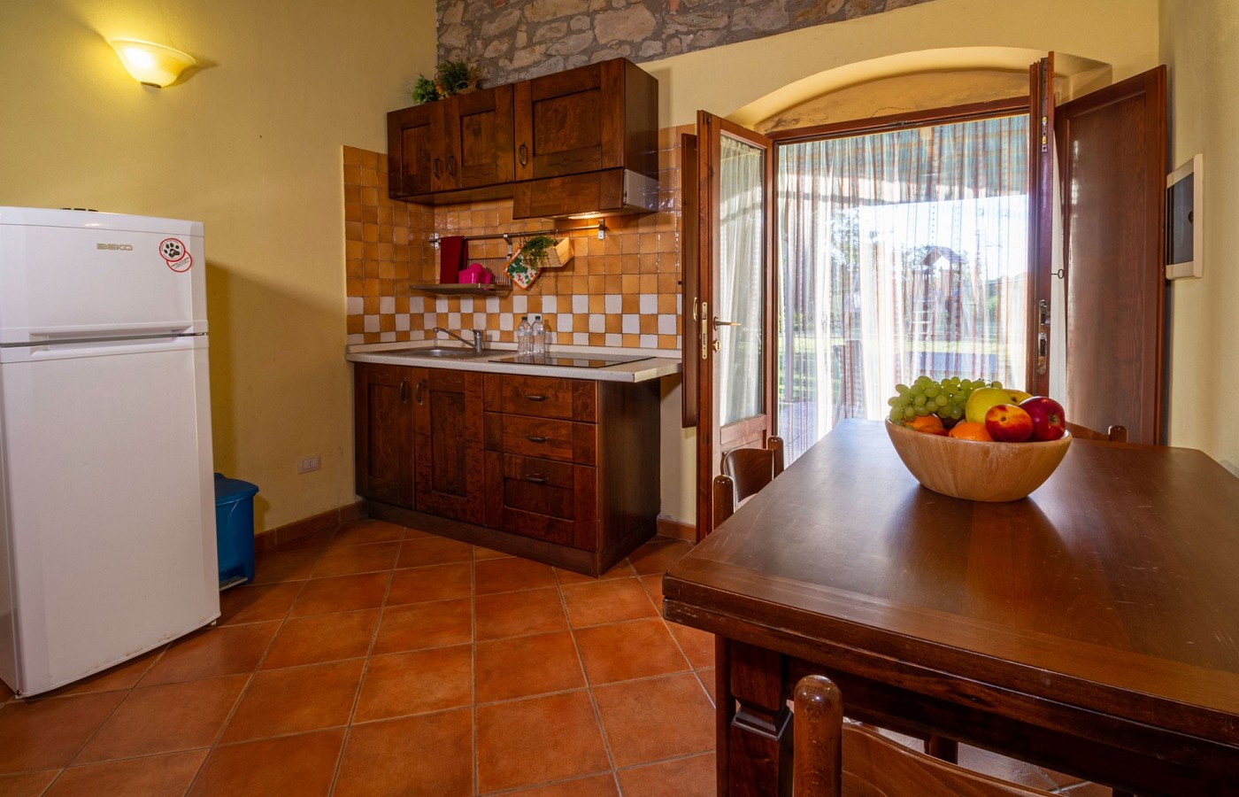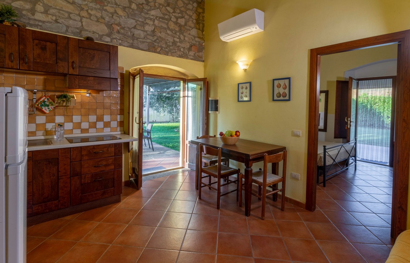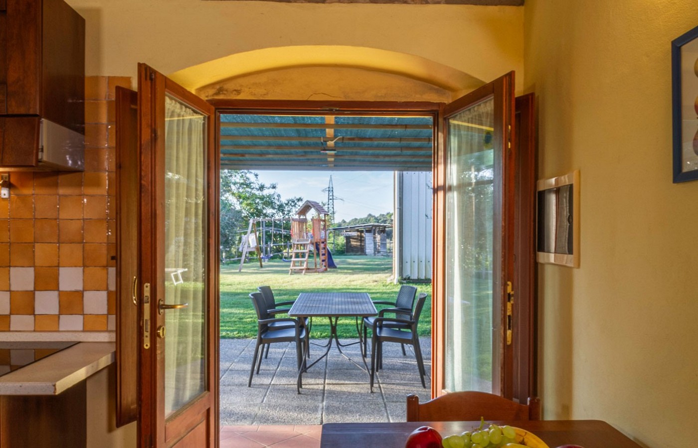 The living area opens onto a gazebo overlooking a beautiful private garden, ideal for family afternoons and evenings surrounded by nature.